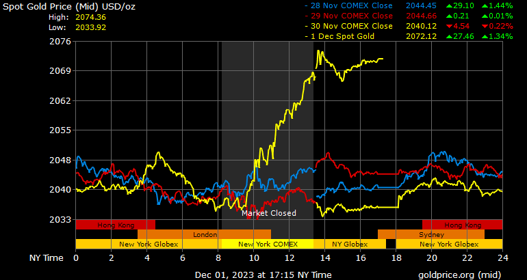 Giá vàng tương lai giao tháng 2/2024 trên sàn Comex New York tăng 32,5 USD, tương ứng tăng 1,58% lên 2.089,7 USD/ounce.