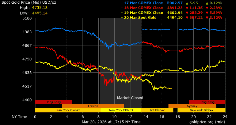 Trên thị trường vàng thế giới, giá vàng giao ngay chốt phiên hôm qua tại Mỹ giảm 153,2 USD, tương ứng giảm 3,29% xuống mức 4.497,5 USD/ounce.