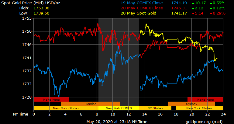 Trên thị trường vàng thế giới, giá vàng giao ngay chốt phiên đêm qua tại Mỹ tăng 3,7 USD lên 1.748,4 USD/ounce. Sang phiên châu Á sáng nay, giá vàng giảm xuống quanh 1.740 USD/ounce. Giá vàng tương lai giao tháng 6 trên sàn Comex New York giảm 11,4 USD xuống 1.747,3 USD/ounce.