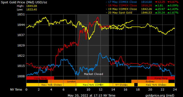 Giá vàng tương lai giao tháng 6/2022 trên sàn Comex New York tăng nhẹ 0,9 USD lên 1.842,1 USD/ounce