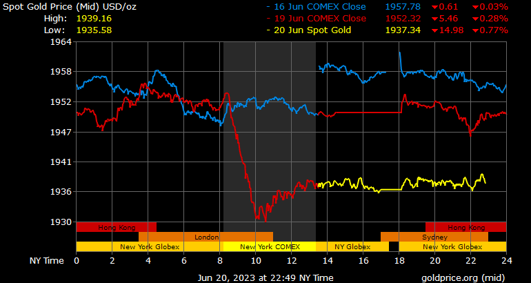 Giá vàng tương lai giao tháng 8/2023 trên sàn Comex New York giảm 23,5 USD, tương ứng giảm 1,19% lên 1.947,7 USD/ounce.
