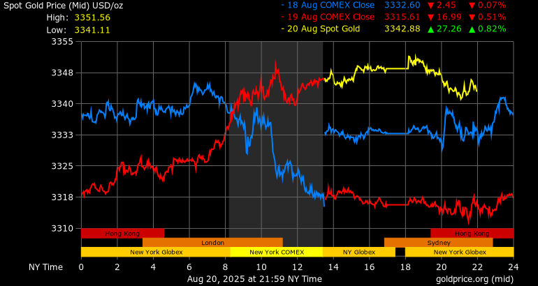 Trên thị trường vàng thế giới, giá vàng giao ngay chốt phiên hôm qua tại Mỹ tăng 32,8 USD lên mức 3.348,5 USD/ounce. Sang phiên châu Á sáng nay, giá vàng đảo chiều giảm 5,3 USD xuống 3.343,2 USD/ounce.