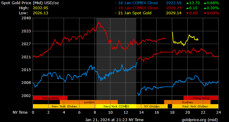 Trên thị trường vàng thế giới, giá vàng giao ngay chốt phiên cuối tuần qua tại Mỹ tăng 6,6 USD lên 2.029,6 USD/ounce. Sang phiên châu Á sáng nay, giá vàng đảo chiều giảm nhẹ 0,2 USD lên 2.029,4 USD/ounce.