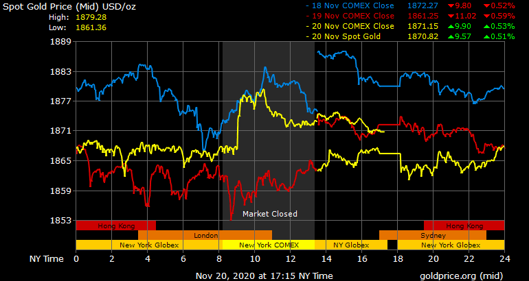 Trên thị trường vàng thế giới, giá vàng giao ngay chốt phiên cuối tuần tại Mỹ tăng 4,4 USD lên 1.870,4 USD/ounce. Giá vàng tương lai giao tháng 12 trên sàn Comex New York tăng hơn 8 USD lên 1.869,6 USD/ounce.