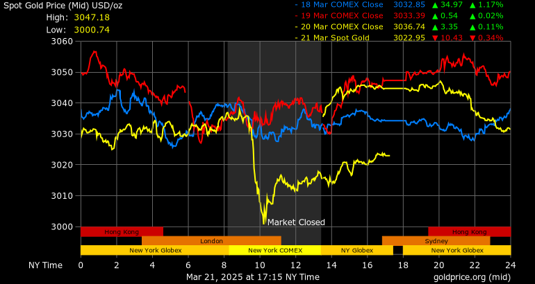 Giá vàng tương lai giao tháng 4/2025 trên sàn Comex New York giảm 22,4 USD, tương ứng giảm 0,74% xuống mức 3.021,4 USD/ounce.
