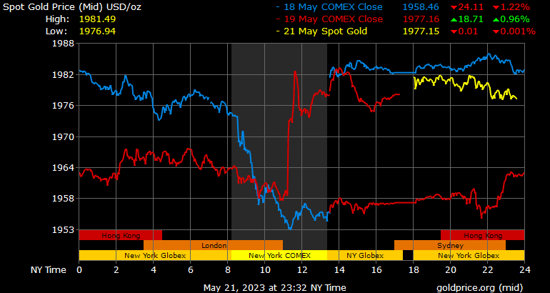Giá vàng tương lai giao tháng 6/2023 trên sàn Comex New York tăng 21,8 USD, tương ứng tăng 1,11% lên 1.981,6 USD/ounce.
