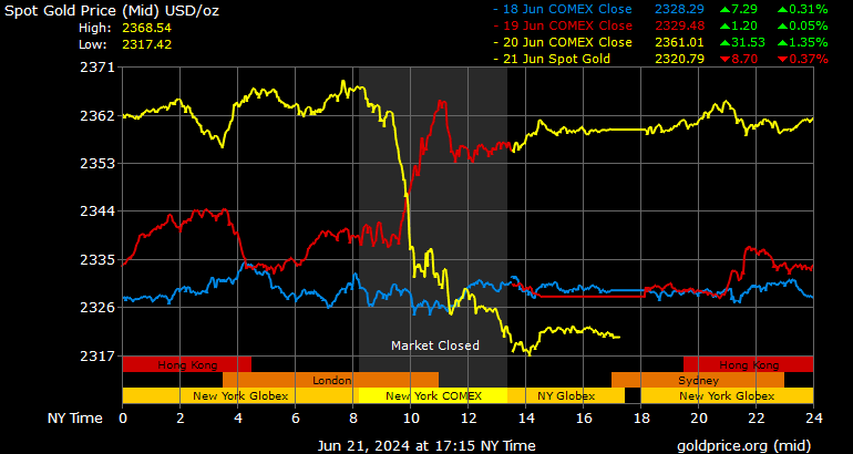 Trên thị trường vàng thế giới, giá vàng giao ngay chốt phiên hôm qua tại Mỹ giảm 38,3 USD xuống 2.321,9 USD/ounce.