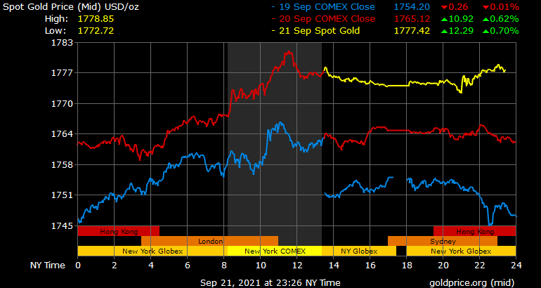 Giá vàng tương lai giao tháng 10 trên sàn Comex New York tăng gần 1 USD lên 1.777 USD/ounce.