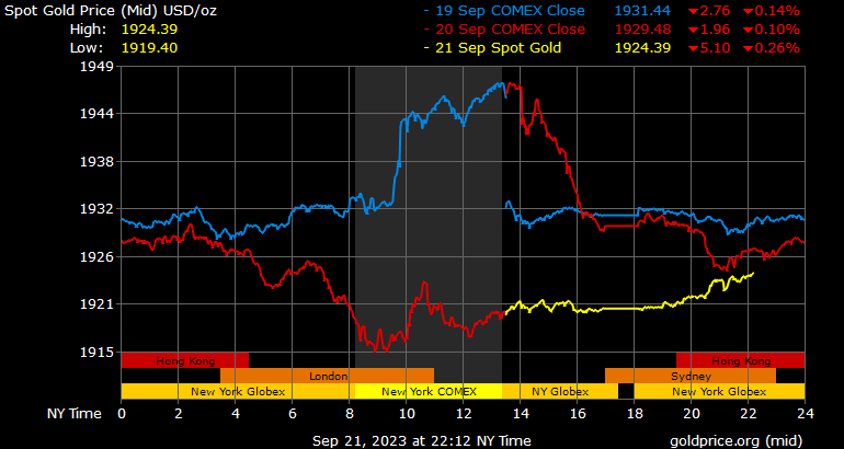 Trên thị trường vàng thế giới, giá vàng giao ngay chốt phiên hôm qua tại Mỹ giảm 10,3 USD xuống 1.919,5 USD/ounce. Sang phiên châu Á sáng nay, giá vàng đảo chiều hồi phục nhẹ lên mức 1.923,6 USD/ounce.