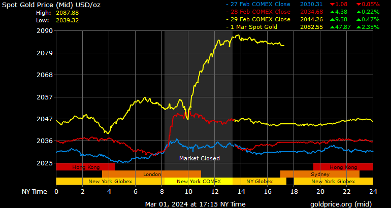 Giá vàng tương lai giao tháng 4/2024 trên sàn Comex New York tăng 41 USD, tương ứng tăng 2% lên 2.095,7 USD/ounce.