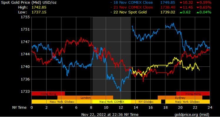 Giá vàng tương lai giao tháng 12/2022 trên sàn Comex New York nhích nhẹ 0,3 USD lên mức 1.739,9 USD/ounce.