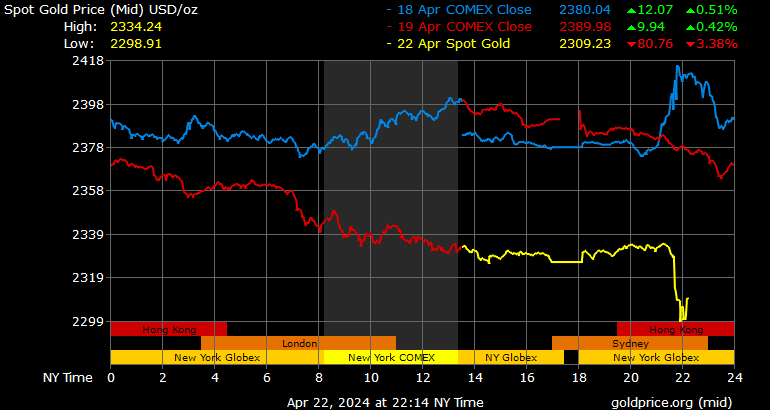 Giá vàng tương lai giao tháng 6/2024 trên sàn Comex New York giảm 67,4 USD, tương ứng giảm 2,79% xuống mức 2.346,4 USD/ounce.
