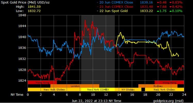 Giá vàng tương lai giao tháng 8/2022 trên sàn Comex New York giảm nhẹ 0,4 USD xuống 1.838,4 USD/ounce.