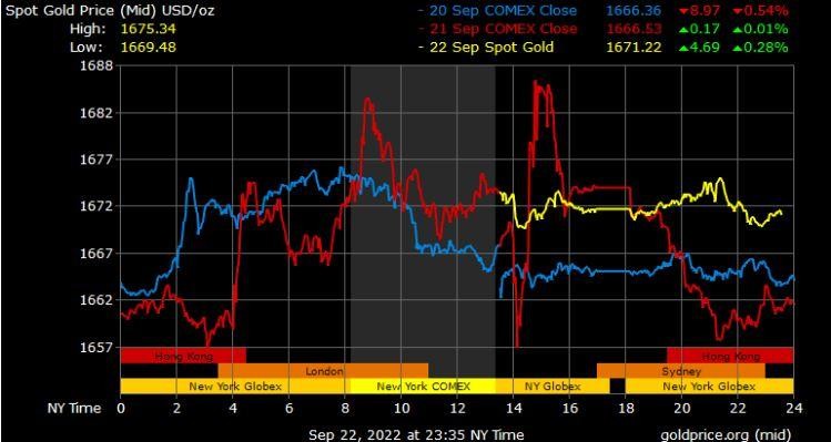 Giá vàng tương lai giao tháng 10/2022 trên sàn Comex New York tăng 5,6 USD lên 1.671,4 USD/ounce.