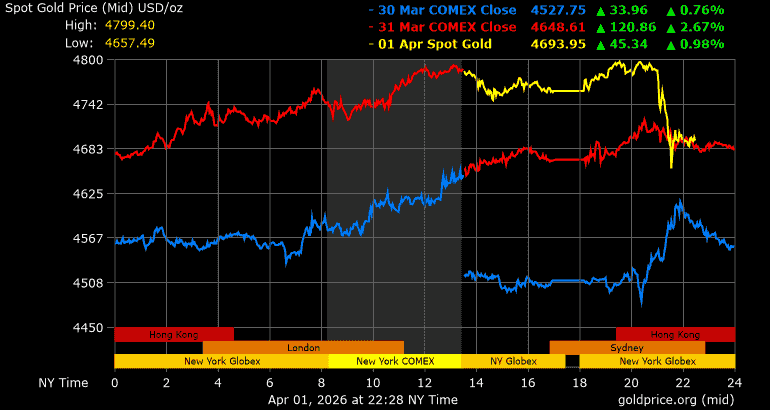 Trên thị trường vàng thế giới, giá vàng giao ngay chốt phiên hôm qua tại Mỹ tăng 90,3 USD, tương ứng tăng 1,94% lên mức 4.758,2 USD/ounce. Sang phiên châu Á sáng nay, giá vàng đảo chiều giảm 69,9 USD xuống mức 4.688,3 USD/ounce.