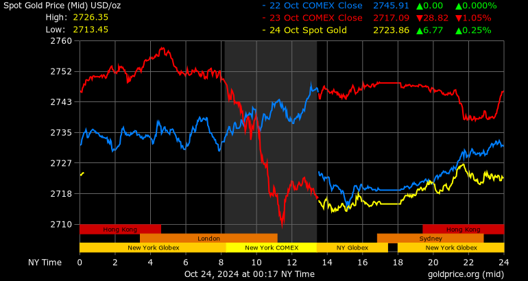 Trên thị trường vàng thế giới, giá vàng giao ngay chốt phiên hôm qua tại Mỹ giảm mạnh 33,4 USD xuống 2.715,6 USD/ounce. Sang phiên châu Á sáng nay, giá vàng đảo chiều tăng 8,7 USD lên 2.724,3 USD/ounce.