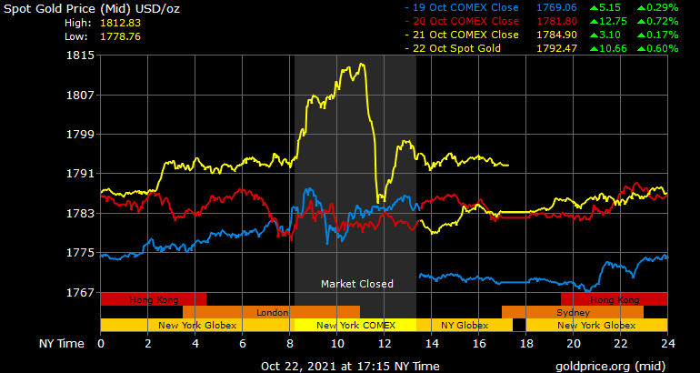 Trên thị trường vàng thế giới, giá vàng giao ngay chốt cuối tuần tại Mỹ tăng 8,9 USD lên 1.792 USD/ounce. Giá vàng tương lai giao tháng 11 trên sàn Comex New tăng gần 13 USD lên 1.794,1 USD/ounce.