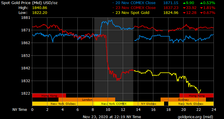 Trên thị trường vàng thế giới, giá vàng giao ngay chốt phiên đêm tại Mỹ giảm 33 USD xuống 1.837,4 USD/ounce. Sang phiên châu Á sáng nay, giá giảm mạnh tiếp xuống dưới 1.825 USD/ounce. Giá vàng tương lai giao tháng 12 trên sàn Comex New York giảm 17 USD xuống 1.820,8 USD/ounce.