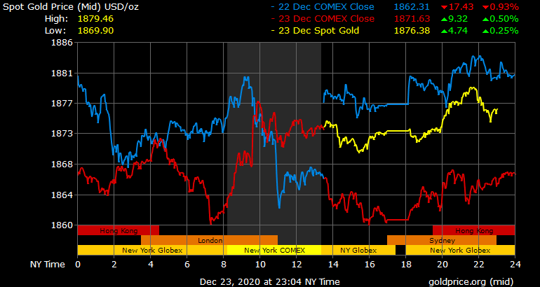 Giá vàng tương lai giao tháng 1/2021 trên sàn Comex New York tăng 4,5 USD lên 1.880,1 USD/ounce.