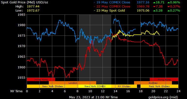 Giá vàng tương lai giao tháng 6/2023 trên sàn Comex New York giảm 2,7 USD, tương ứng giảm 0,14% lên 1.974,5 USD/ounce.