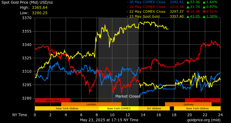 Bên cạnh đó, thị trường chứng khoán Hoa Kỳ lại trở nên chao đảo vào sáng thứ sáu sau một vài bài đăng trên mạng xã hội của Tổng thống Trump. Điều đó có lợi cho vàng trú ẩn an toàn. Bài đăng của Tổng thống Mỹ cho biết, iPhone của Apple sẽ bị áp thuế 25% nếu không được sản xuất tại Mỹ. Bài đăng khác cho thấy, các cuộc đàm phán thương mại giữa Mỹ và Liên minh châu Âu (EU) đang đi vào bế tắc. Mỹ dự kiến sẽ áp thuế 50% đối với EU bắt đầu từ ngày 1/6.