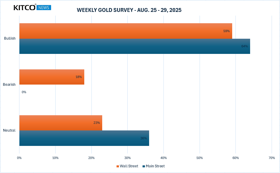 Trong khi đó, 194 phiếu bầu đã được bỏ ra trong cuộc thăm dò trực tuyến của Kitco, với các nhà đầu tư Main Street cũng đã giảm bớt tâm lý lạc quan gần đây nhưng vẫn giữ vững sự lạc quan về triển vọng của vàng. Tổng cộng 115 nhà giao dịch bán lẻ, tương đương 59%, dự đoán giá vàng sẽ tăng vào tuần tới, trong khi 35 nhà giao dịch khác, tương đương 18%, dự đoán kim loại quý này sẽ giảm giá. 44 nhà đầu tư còn lại, chiếm 23% tổng số, dự đoán vàng sẽ có xu hướng đi ngang trong thời gian tới.
