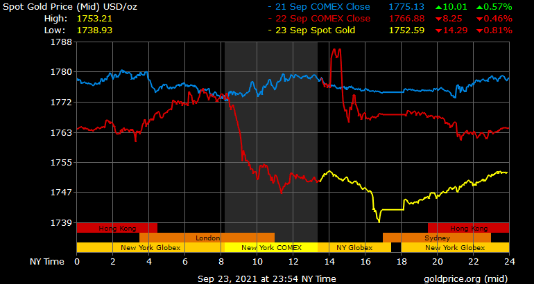 Trên thị trường vàng thế giới, giá vàng giao ngay chốt phiên đêm qua tại Mỹ giảm 25,1 USD xuống 1.742,8 USD/ounce. Sang phiên châu Á sáng nay, giá vàng hồi phục lên trên gần 1.755 USD/ounce.