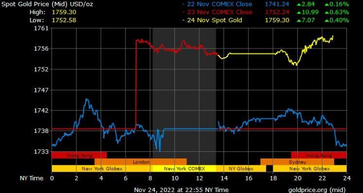 Vàng quay trở lại trên 1.750 USD bắt đầu vào thứ Tư sau khi Cục Dự trữ Liên bang báo hiệu trong biên bản cuộc họp chính sách tiền tệ tháng 11 rằng họ sẽ làm chậm tốc độ tăng lãi suất bắt đầu vào tháng 12. Tuy nhiên, các thị trường đã định giá ở mức 50 điểm cơ bản trước vài phút.