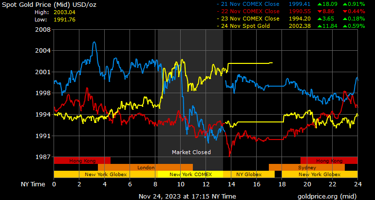 Giá vàng tương lai giao tháng 12/2023 trên sàn Comex New York tăng 10,2 USD, tương ứng tăng 0,51% lên 2.003 USD/ounce.