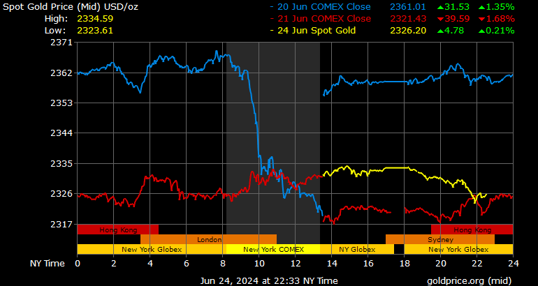 Trên thị trường vàng thế giới, giá vàng giao ngay chốt phiên hôm qua tại Mỹ tăng 12,6 USD lên 2.334,4 USD/ounce. Sang phiên châu Á sáng nay, giá vàng đảo chiều giảm 7,5 USD xuống 2.326,9 USD/ounce.