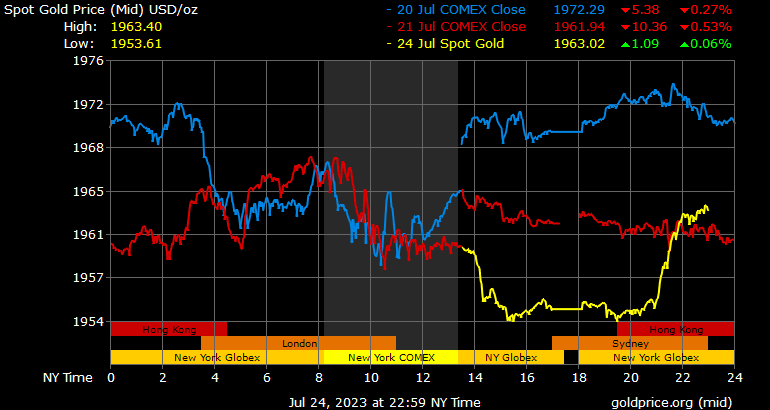Giá vàng tương lai giao tháng 8/2023 trên sàn Comex New York giảm 4,4 USD, tương ứng giảm 0,22% xuống 1.962,2 USD/ounce.