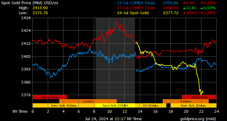 Trên thị trường vàng thế giới, giá vàng giao ngay chốt phiên hôm qua tại Mỹ giảm 12,3 USD xuống 2.397,4 USD/ounce. Sang phiên châu Á sáng nay, giá vàng tiếp tục giảm 20,9 USD xuống 2.376,5 USD/ounce.