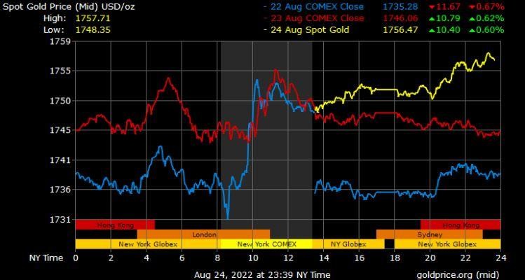 Giá vàng tương lai giao tháng 10/2022 trên sàn Comex New York tăng nhẹ 0,5 USD lên 1.752 USD/ounce.