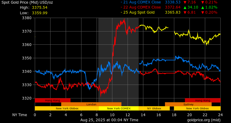 Trên thị trường vàng thế giới, giá vàng giao ngay chốt phiên hôm qua tại Mỹ tăng 32,5 USD lên 3.371,2 USD/ounce. Sang phiên châu Á sáng nay, giá vàng đảo chiều giảm 5,6 USD xuống 3.365,7 USD/ounce.
