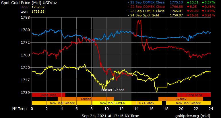 Trên thị trường vàng thế giới, giá vàng giao ngay chốt phiên đêm qua tại Mỹ tăng 7,4 USD lên 1.750,2 USD/ounce. Giá vàng tương lai giao tháng 10 trên sàn Comex New York tăng 1 USD lên 1.748,7 USD/ounce.
