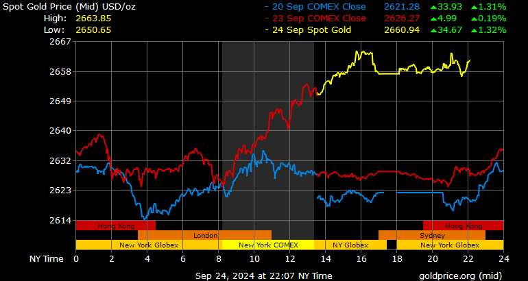 Trên thị trường vàng thế giới, giá vàng giao ngay chốt phiên hôm qua tại Mỹ tiếp tục tăng mạnh 28,6 USD lên 2.657,3 USD/ounce. Sang phiên châu Á sáng nay, giá vàng tăng 5,5 USD lên 2.662,8 USD/ounce.