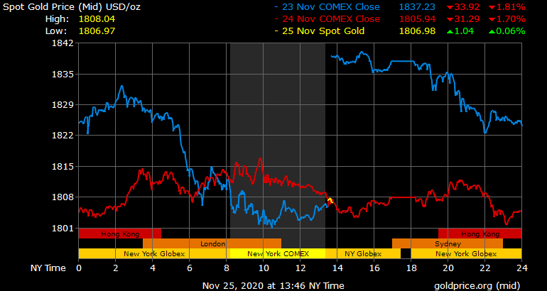 Trên thị trường vàng thế giới, giá vàng giao ngay chốt phiên đêm tại Mỹ giảm 0,9 USD xuống 1.808,1 USD/ounce. Sang phiên châu Á sáng nay, giá vàng nhích nhẹ lên 1.810 USD/ounce. Giá vàng tương lai giao tháng 12 trên sàn Comex New York tăng hơn 1 USD xuống 1.805,9 USD/ounce.