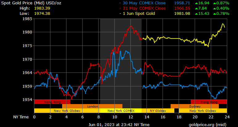 Giá vàng tương lai giao tháng 8/2023 trên sàn Comex New York tăng 13,4 USD, tương ứng tăng 0,68% lên 1.995,5 USD/ounce.