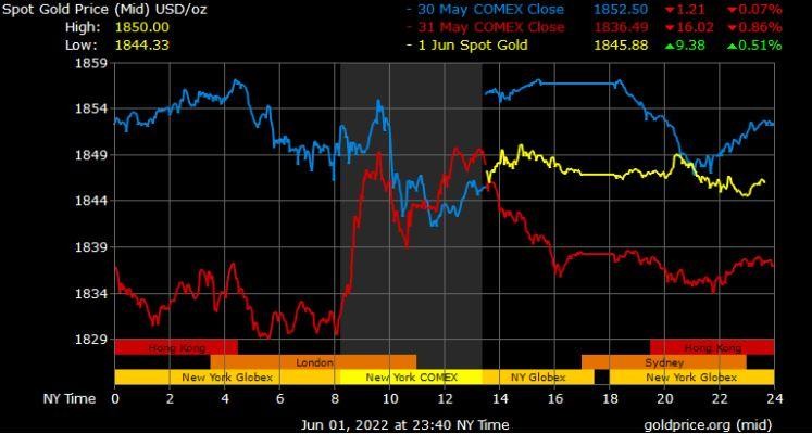 Giá vàng tương lai giao tháng 8/2022 trên sàn Comex New York tăng nhẹ 0,3 USD lên mức 1.848,7 USD/ounce.
