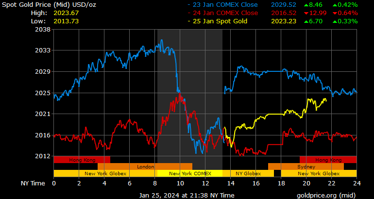 Giá vàng tương lai giao tháng 2/2024 trên sàn Comex New York tăng 1,8 USD, tương ứng tăng 0,09% xuống mức 2.017,8 USD/ounce.
