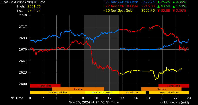 Giá vàng tương lai giao tháng 12/2024 trên sàn Comex New York giảm 93,7 USD, tương ứng giảm 3,45% xuống mức 2.618,5 USD/ounce.