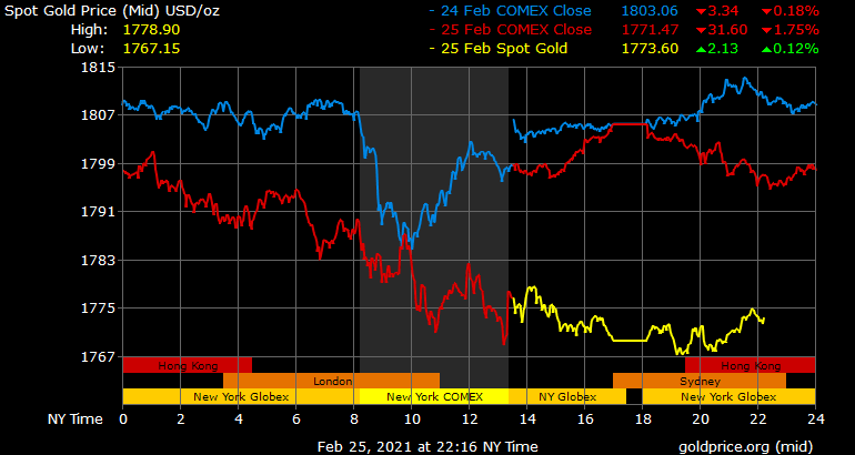 Giá vàng tương lai giao tháng 4 trên sàn Comex New York giảm 3,8 USD xuống 1.771,6 USD/ounce.