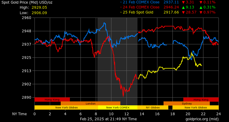 Giá vàng tương lai giao tháng 4/2025 trên sàn Comex New York giảm mạnh 44,4 USD, tương ứng giảm 1,5% xuống mức 2.918,8 USD/ounce.