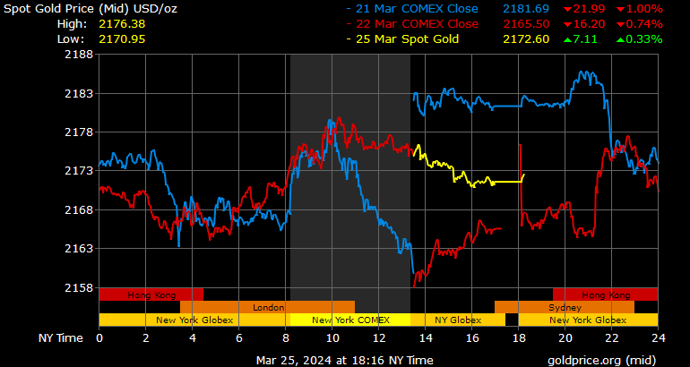 Giá vàng tương lai giao tháng 4/2024 trên sàn Comex New York tăng 16,4 USD, tương ứng tăng 0,76% lên mức 2.176,4 USD/ounce.