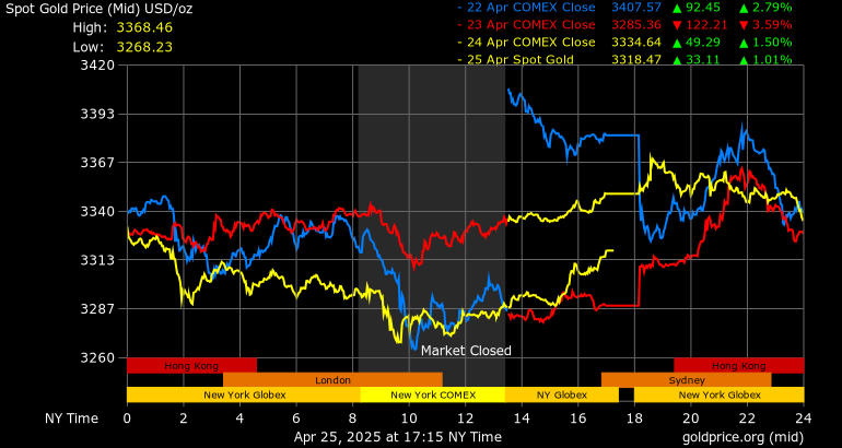 Giá vàng tương lai giao tháng 6/2025 trên sàn Comex New York giảm 50,2 USD, tương ứng giảm 1,5% xuống mức 3.298,4 USD/ounce.