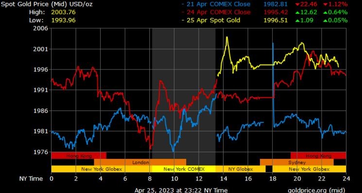 Giá vàng tương lai giao tháng 6/2023 trên sàn Comex New York tăng 4,7 USD, tương ứng tăng 0,24% xuống 2.004,5 USD/ounce.