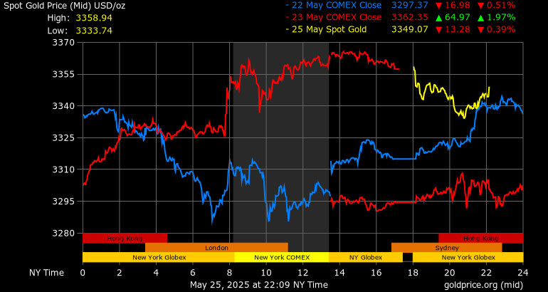 Trên thị trường vàng thế giới, giá vàng giao ngay chốt phiên cuối tuần qua tại Mỹ tăng 63,1 USD lên mức 3.358,1 USD/ounce. Sang phiên châu Á sáng nay, giá vàng đảo chiều giảm 9,5 USD xuống 3.348,7 USD/ounce.