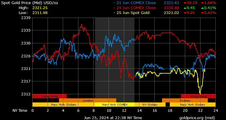 Giá vàng tương lai giao tháng 8/2024 trên sàn Comex New York giảm 13,6 USD, tương ứng giảm 0,58% xuống mức 2.330,8 USD/ounce.