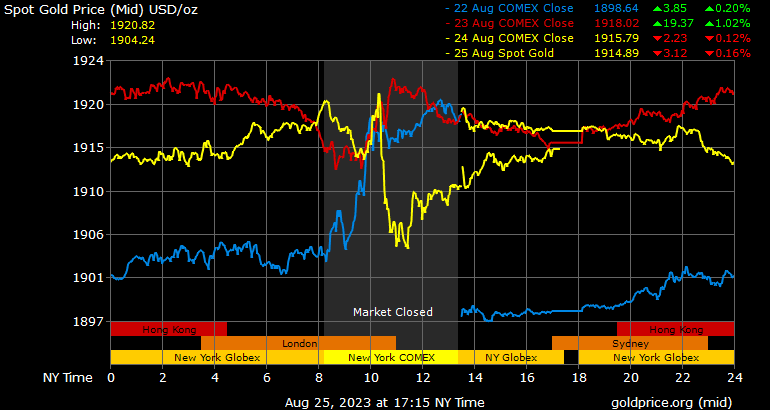 Trên thị trường vàng thế giới, giá vàng giao ngay chốt phiên cuối tuần tại Mỹ giảm nhẹ 1,6 USD xuống 1.914,8 USD/ounce.