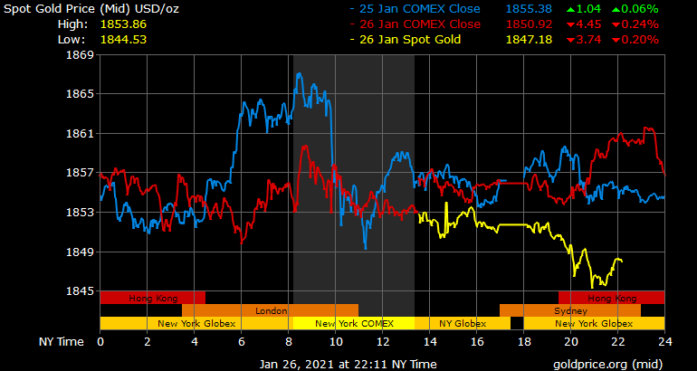 Trên thị trường vàng thế giới, giá vàng giao ngay chốt phiên đêm qua tại Mỹ giảm 5,6 USD xuống 1.850,6 USD/ounce. Sang phiên châu Á sáng nay, giá vàng giảm nhẹ xuống gần 1.847 USD/ounce.